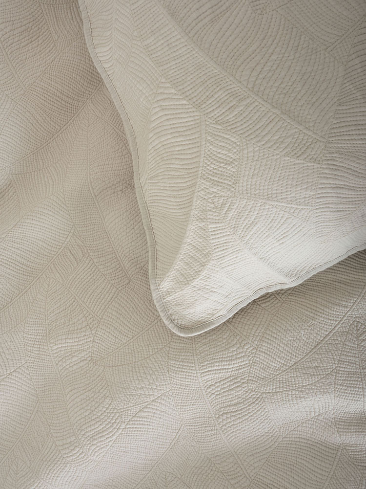Add depth and interest to your space with Manon. The delightful leaf textured quilted bedcover is a quintessential addition to any space. Made from cotton in a calming natural hue, style Manon with the matching bedlinen to complete the serene atmosphere.