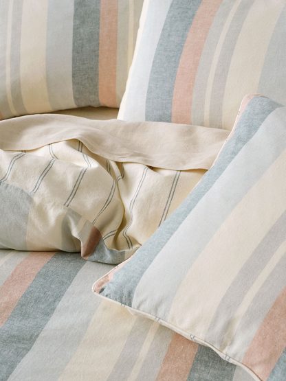 A yarn-dyed, striped knockout in a soothing palette, Reverie is beautifully woven from a soft cotton and linen blend, giving it a lovely drape and texture for your contemporary bedroom. This ensemble enjoys saltwater, sky and praline hues, reverses to a simpler stripe.