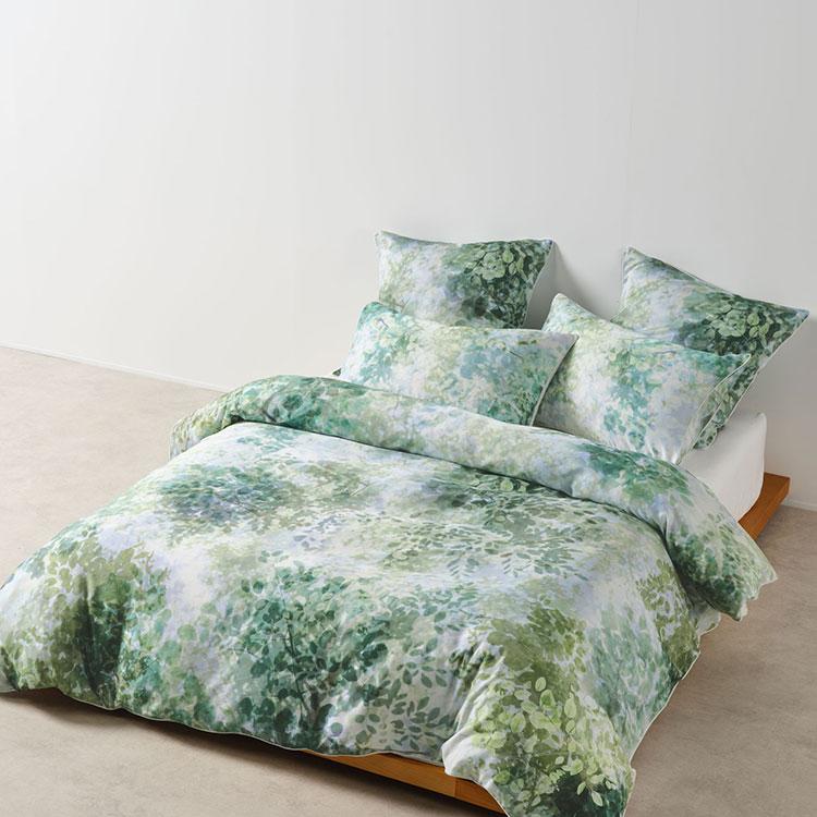 Treetop’s array of green and blue invites you to a dream escape. Printed on luxe cotton sateen, this leafy, visual delight is finished with a cord piping trim.
